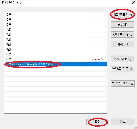 새로 만들기 후 복사한 java-bin 설치 경로 추가 후 확인 cmd -> java -version 쳐서 나오는지 확인하기.